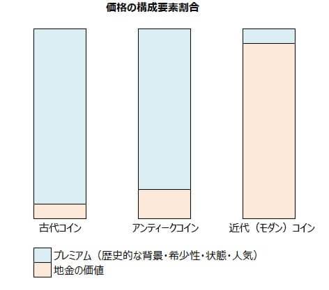 「地金の価値」+「プレミアム(歴史的な背景・希少性・状態・人気)」によって決まります。